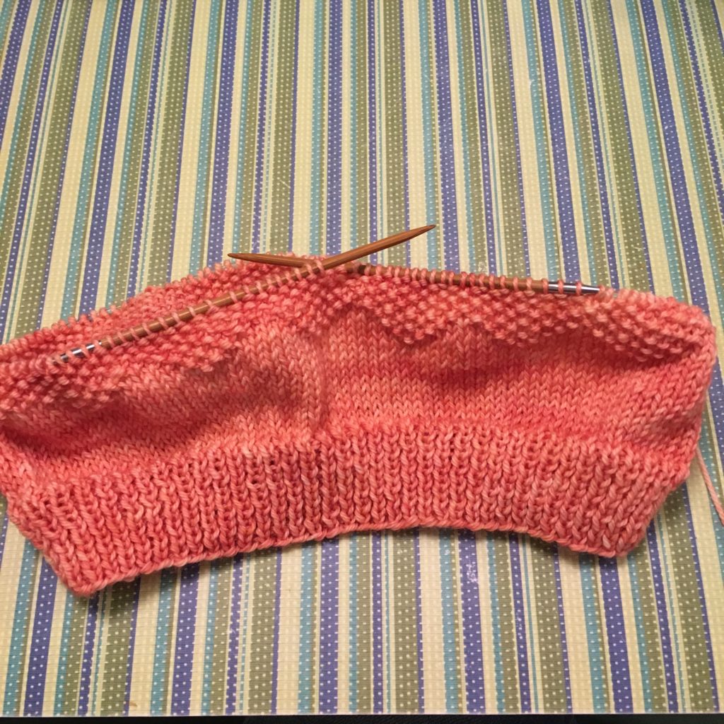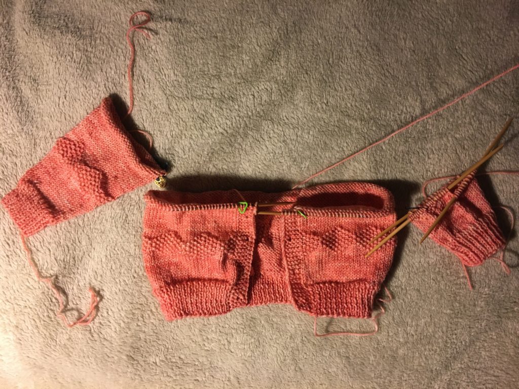 I thought it would be good to give it a try because I haven’t done any bottom-up garments before; I’ve always preferred top-down construction. This was a good learning experience; and the shawl collar was great practice for short rows with its many W&Ts.