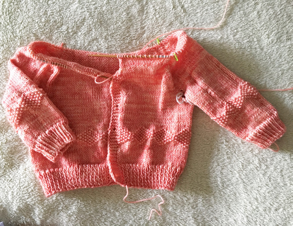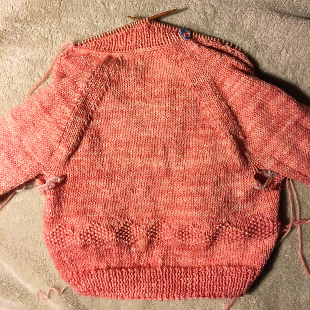 I found Cuddle Time on Ravelry and decided to give it a try. It is bottom-up construction, then the sleeves are knitted separately and joined to the bottom half of the body, and then the collar edge is picked up and a shawl collar is added. So sweet!