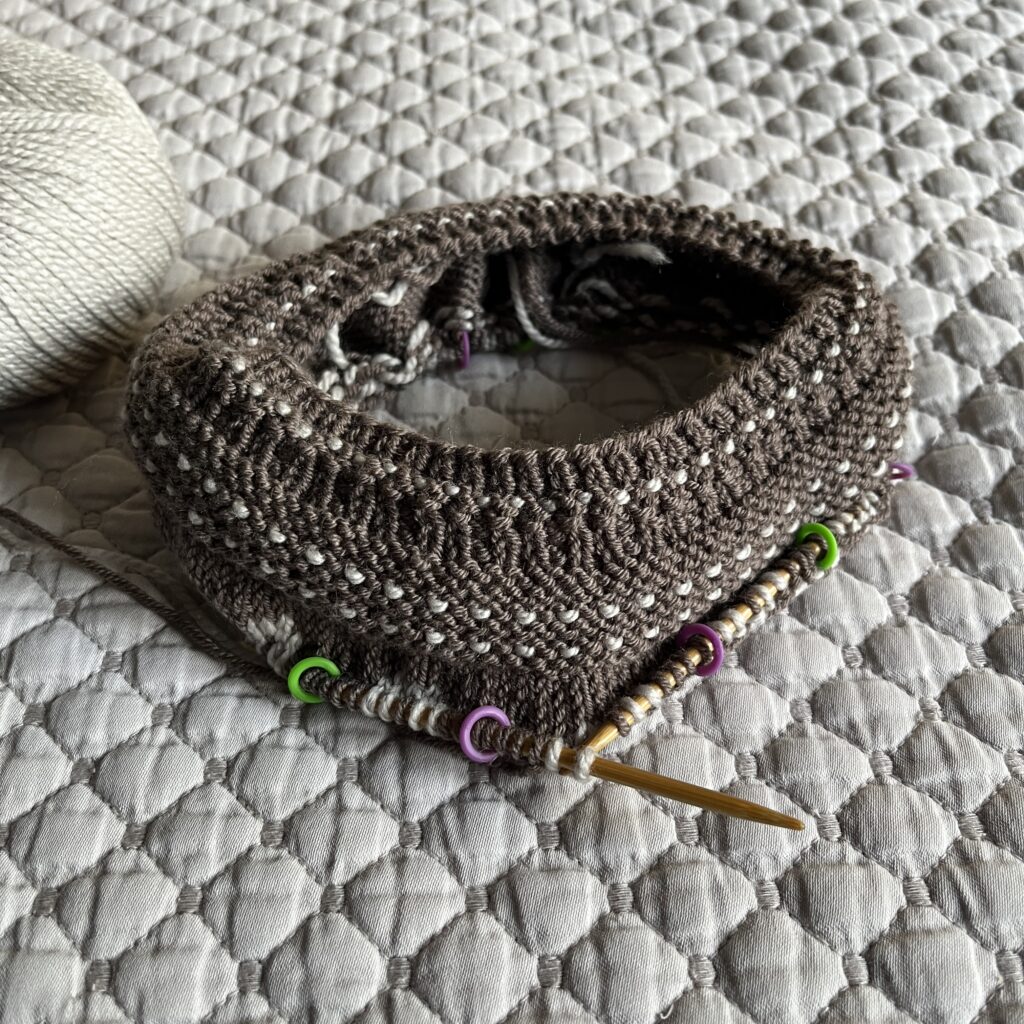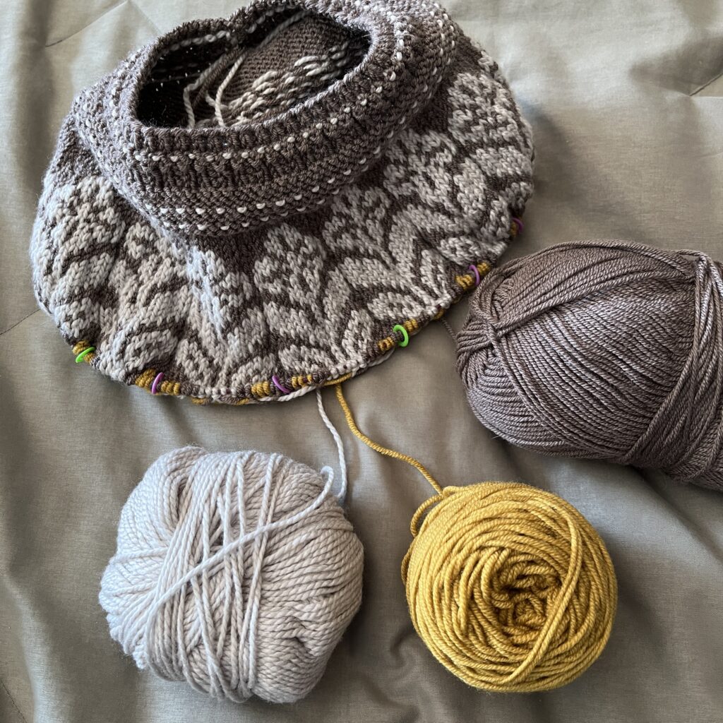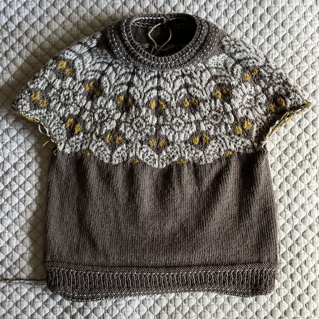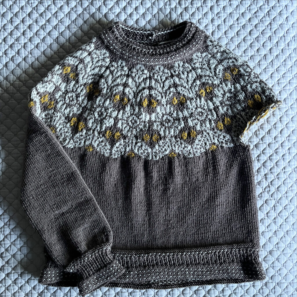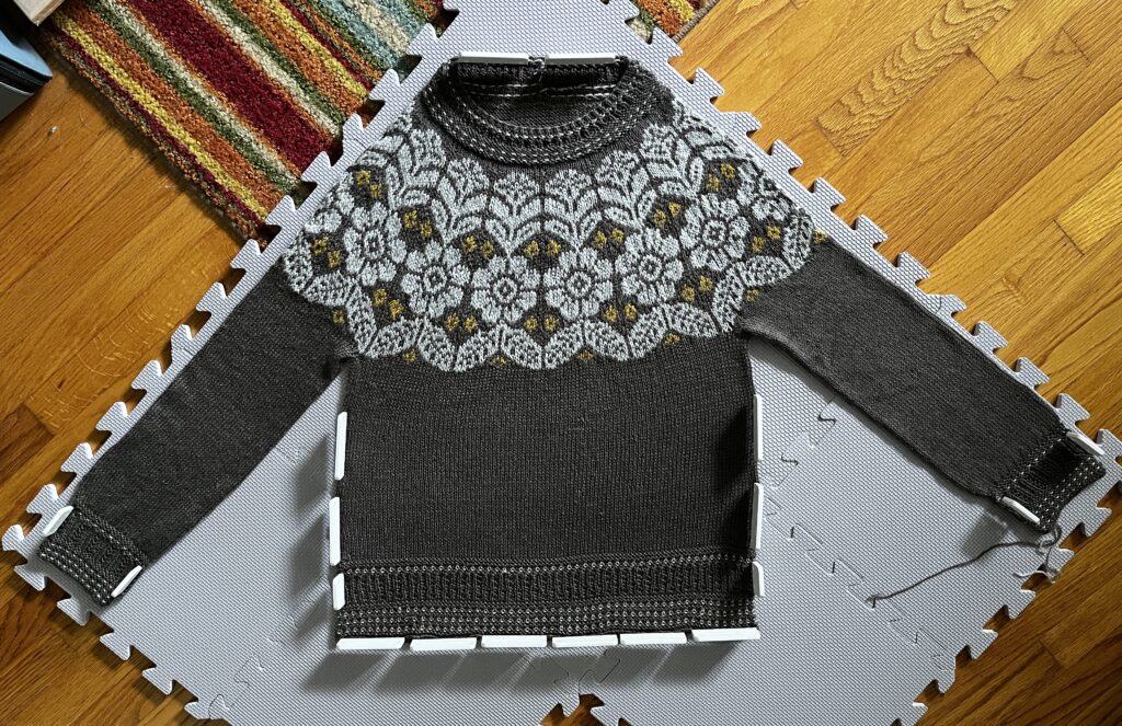 It was pretty challenging to knit with three colors at once. I had to be super mindful of tension so it doesn’t come out too tight, and also not get all the yarns twisted together while switching and catching floats. It took a full month to finish the yoke – I’m not super happy with how I handled CC2 (Dijon), but I learned a lot.