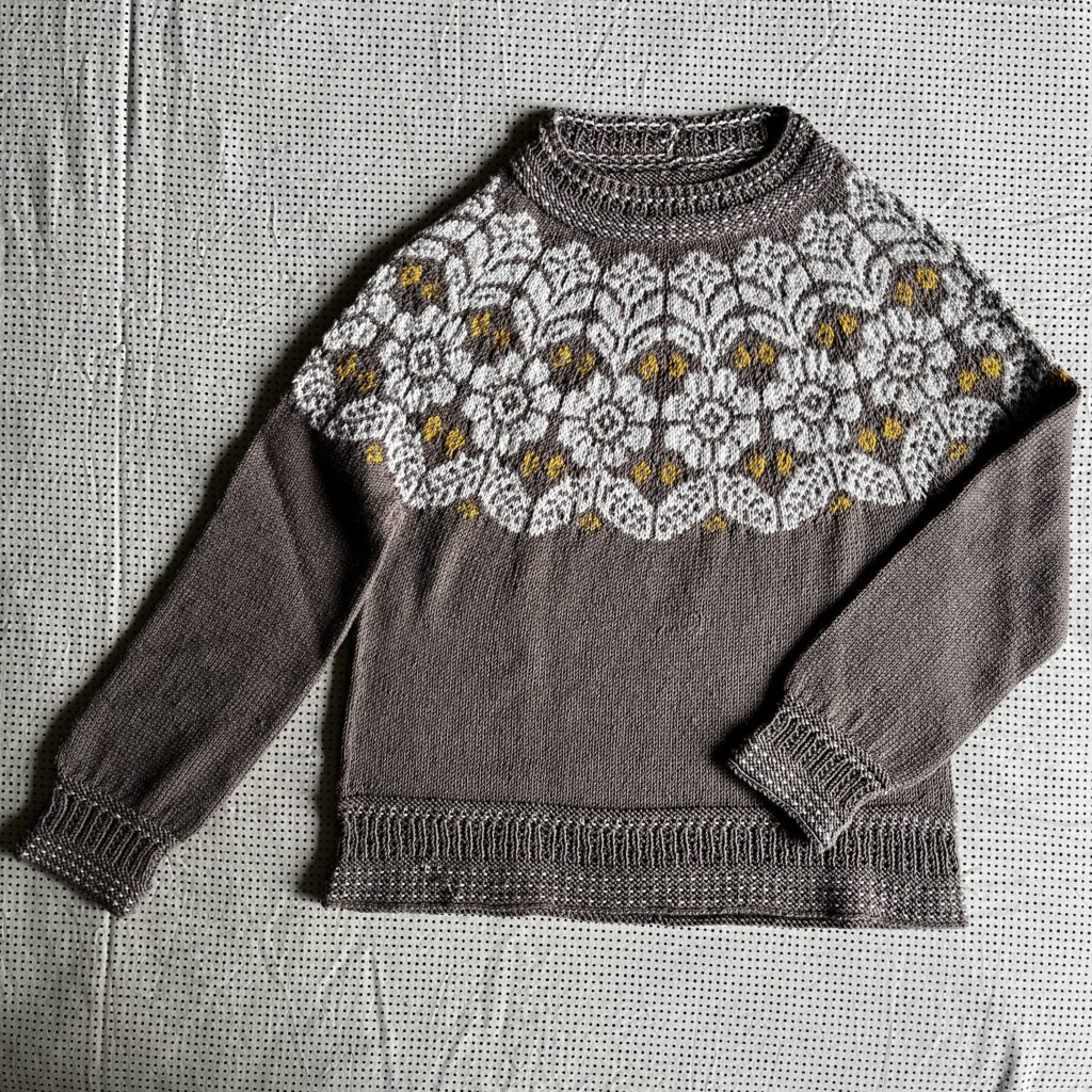 While browsing Ravelry, I decided to keep going further into colorwork with this pattern – Autumn Alpine by Boyland Knitworks. The Scandinavian-style floral yoke looked fun to knit, and after seeing Meredith/magicktryx’s Autumn Alpine, I really wanted to try using 2 CCs, too.
