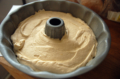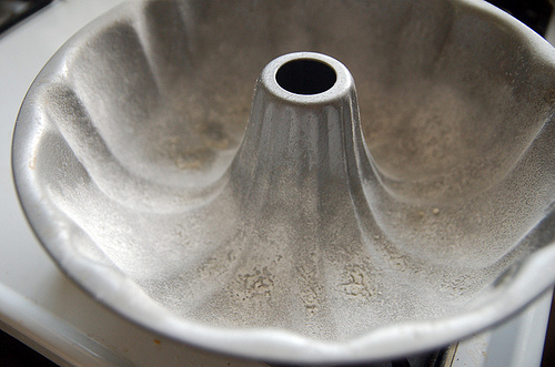 The Bundt pan, Pam-ed and floured. I don’t have the specialty Pam for baking so I did it the old-fashioned way.