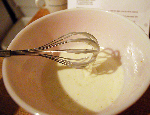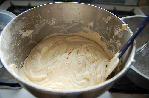 Mixing up the wet ingredients: butter, sugar, vanilla extract, lemon extract