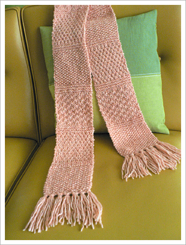 The first scarf I completed this year is the Sampler Scarf (see above). It was a fun way to practice different stitches and to get a handle on tension and stitch size. The yarn I used is the Peach Dolcetto yarn from Jo-Ann’s Sensations Bellezza Collection. I highly recommend it – it’s a wool/cotton blend, non-scratchy, incredibly soft and easy to knit with, plus it’s Italian-made and sold at a great price. Trust me, you can’t find much Italian wool for $5 a skein! The stitches I used are seed stitch, double seed stitch, and box stitch – and plain ol’ garter stitch as dividers. I really like how it turned out.