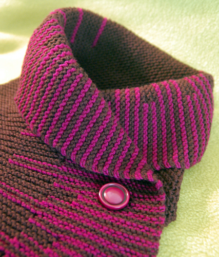 The pattern is free and can be downloaded here (you need to sign up with Lion Brand). It is classified as “Intermediate” but I think it should really be for the “Advanced Beginner.” All it involves is the knit stitch, decreasing, short rows (this version is really simple and sounds harder than it is. No “wrapping” involved), and making a buttonhole. I was able to do it and I’m definitely not an intermediate knitter. Knitting with two colors and doing short rows kept it interesting while not frustrating at all. If you like knitting with smaller needles, this is a perfect project with a big impact.