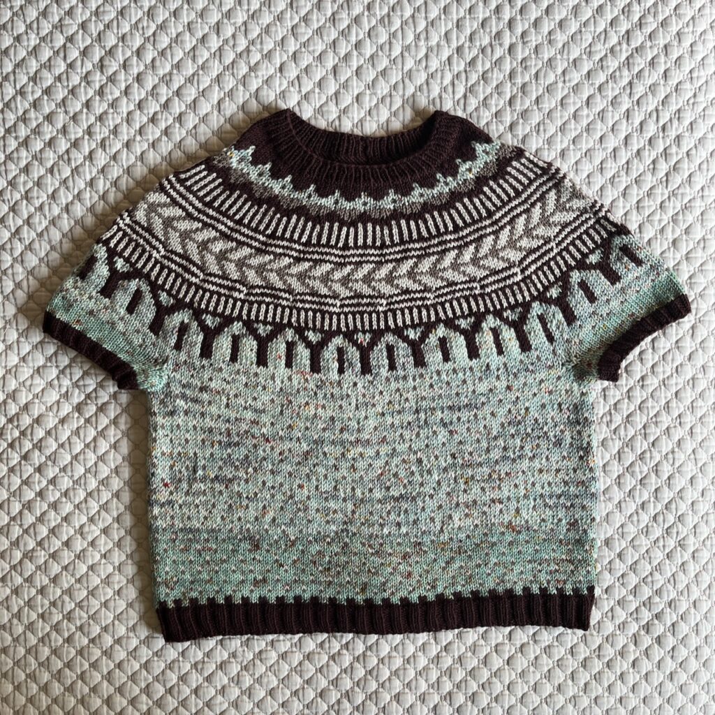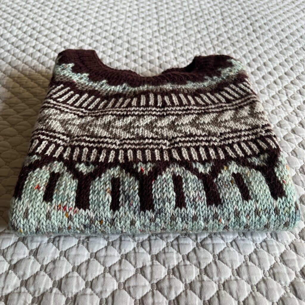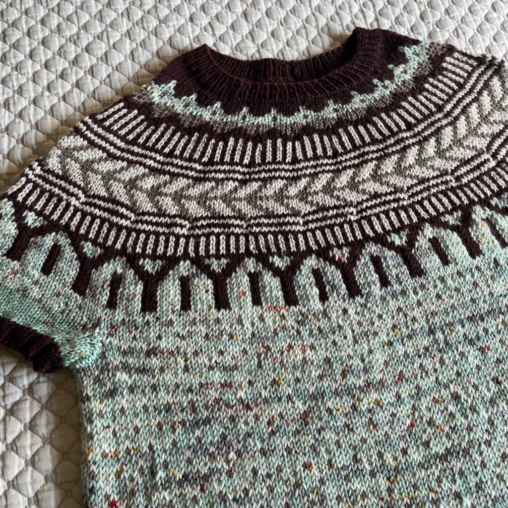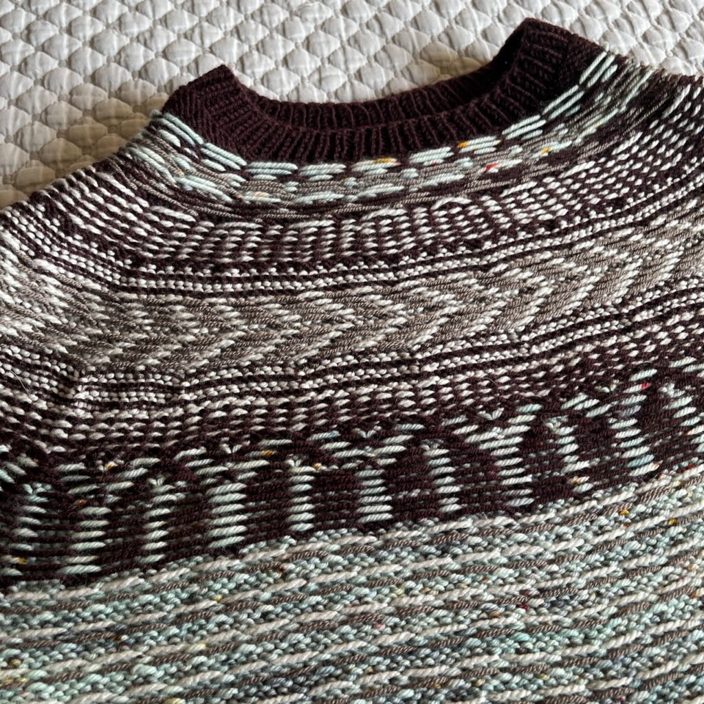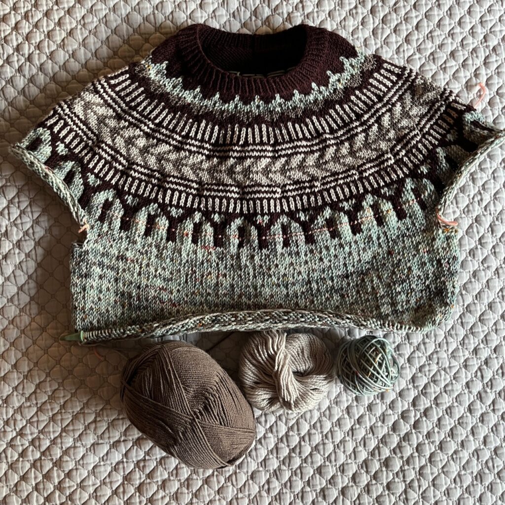 Body finished, before going back to the sleeves. The Gillyweed shades are indeed different, but it doesn’t bother me. I think the speckles help bring them together. 😆