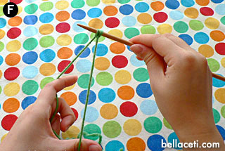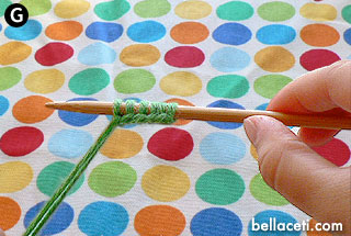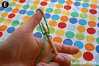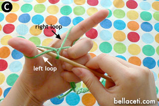 Here’s the part that will take a bit of practice. Take the needle with your right hand and pick up the left loop closest to you from bottom up (Figure C).