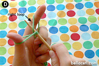 Move the needle to the right side, and pick up the top right loop from bottom up (Figure D). The yarn on the right loop should wrap around the front of the needle counter-clockwise.