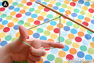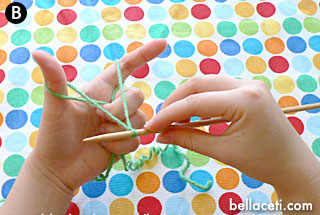 Hold the needle with the slip knot with your right hand. With the left hand, close the bottom three fingers around the yarn, then spread the yarn open with your thumb and index finger (Figure A).