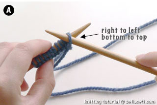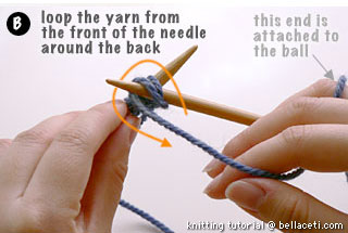 Then take the yarn in your right hand, and loop it around the right needle counterclockwise from back to front (Figure B). Make sure the yarn is in front of the needle and not behind it. You might want to hold the right needle in place with your left thumb so the needle doesn’t slip out.