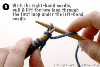 Here’s the most tricky part: using the right needle, carefully lift the new loop into the first loop, under the left-hand needle (Figure C).